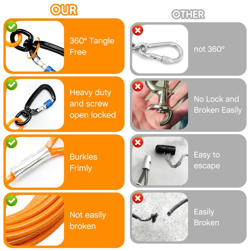 Long lasting and anti-tangling : Our 7*19 stainless steel wire rope dog lead is UV resistantant and more flexiable than other dog cables, Once the rope deforms, quickly returns to its original state,solving the problem of entanglement or twists , keeping your dog safe and comfortable