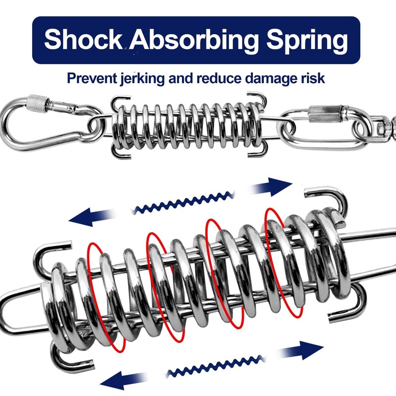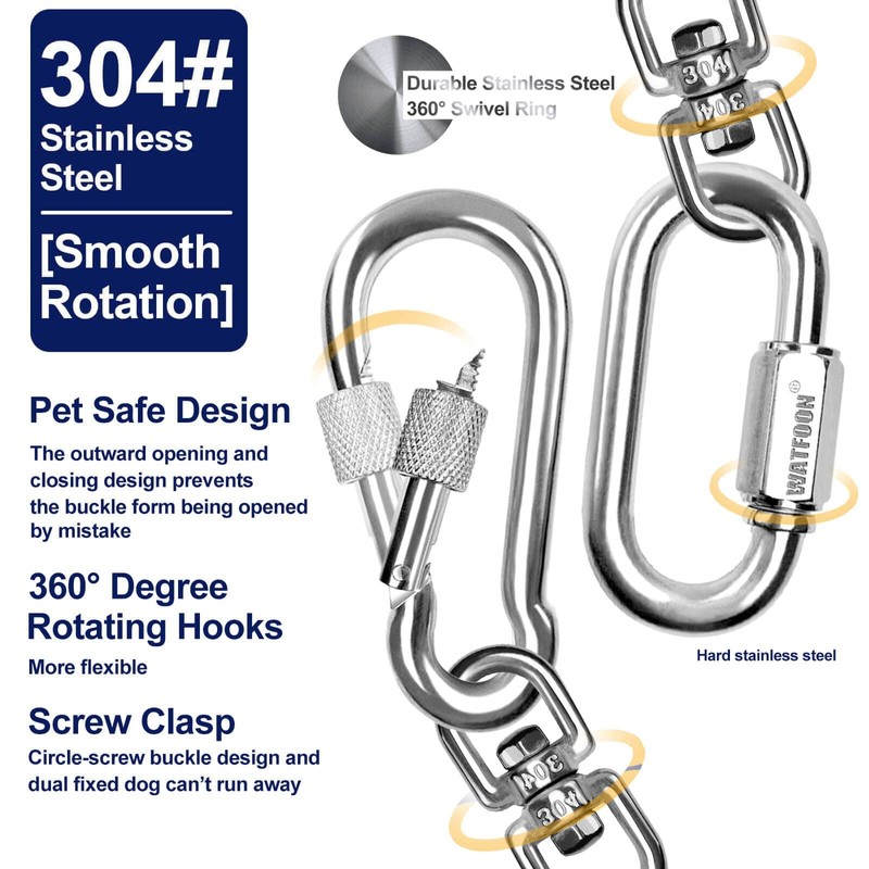 • 304 Stainless Steel Heavy Duty Swivels --- WATFOON dog tie out cable design 360° swivel clips and clasp, The stainless steel hooks which can withstand 480 pounds of pulling force, no matter how vigorous your pet is, the clip will not break.ultra durable and lightweight, allows 360°rotate, more strong and anti-rust than others, on both ends can be easily attached to a spiral stake or ground post