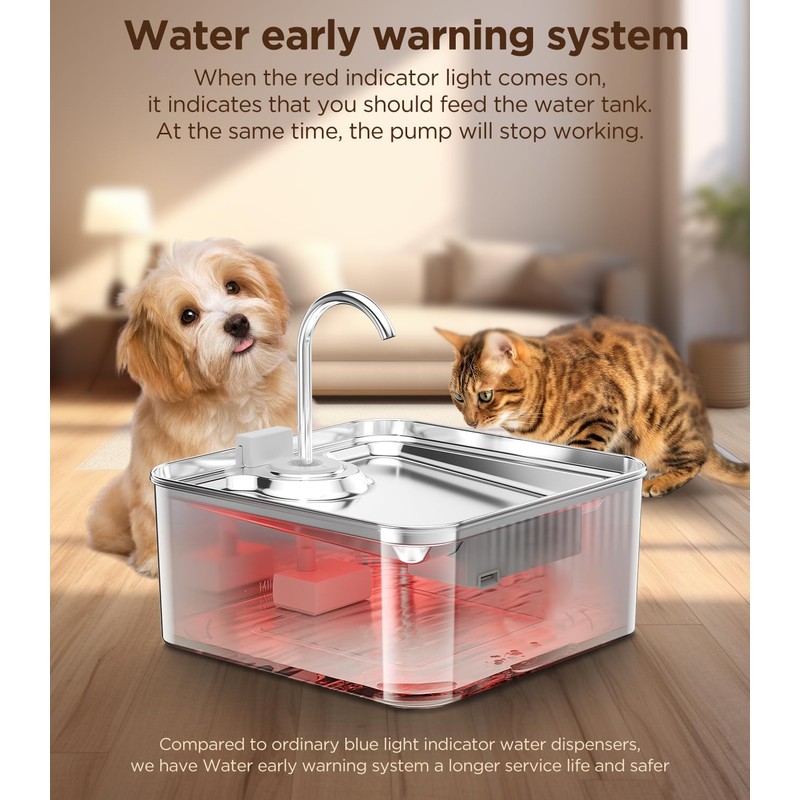 - 【Sturdy transparent water tank】:And the Transparent water tank allows you to see how much water is left at a glance, so you don't have to lift the lid as often,easily keeping track of your pet's drinking situation and avoiding insufficient water levels.With LED indicator lights, the blue light will help you better observe the water level, and allow your pet to easily find the place to drink water at night. When the light turns red, Indicates that you need to refill water in a timely manner