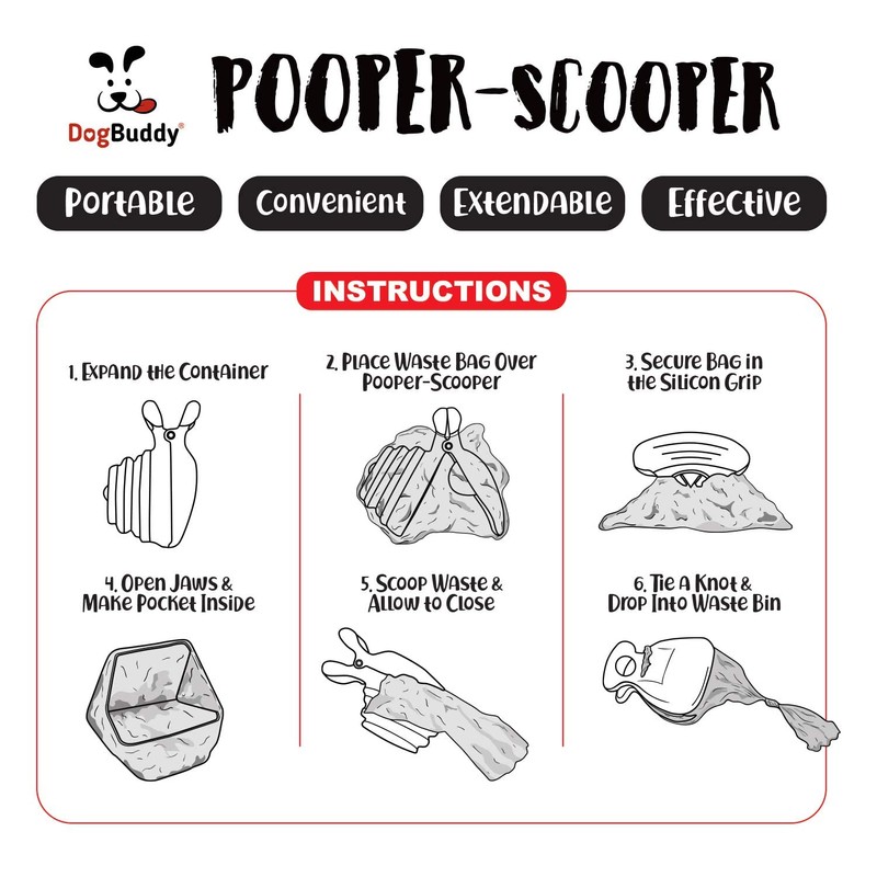 - Stress-Free Cleanup - Enjoy a cleaner, more hygienic way to clean up after your dog. DogBuddy Pooper Scooper removes waste from any surface, keeps your hands clean and your walks enjoyable. Its easy-to-use design makes it a perfect tool that even kids can use.