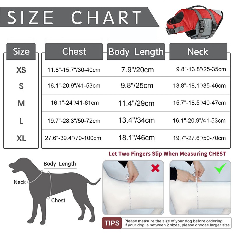 - MEASURE BEFORE PURCHASE : Dog swimming vest are buoyant half-length garments that don’t require full back coverage to perform as intended. Chest girth is the decisive measurement, if your dog is between two sizes, please next size.
