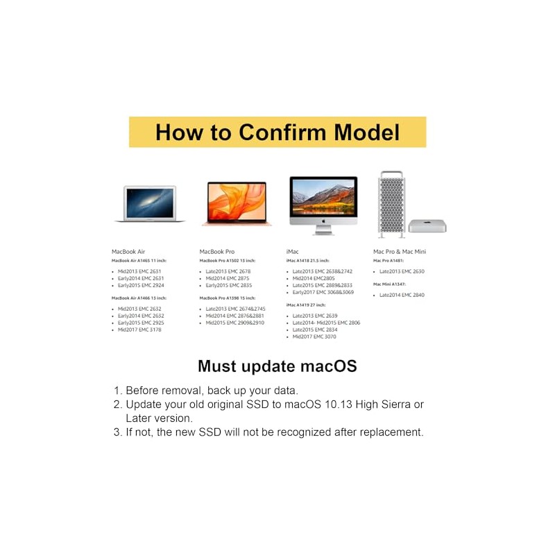 - Before removal, Back up your original data to USB drive; and Updated your old original SSD to mac OS 10.13 High Sierra or Later version. If not, the new SSD will not be recognized after replacement.If your mac does not recognize the drive, then back to the step.