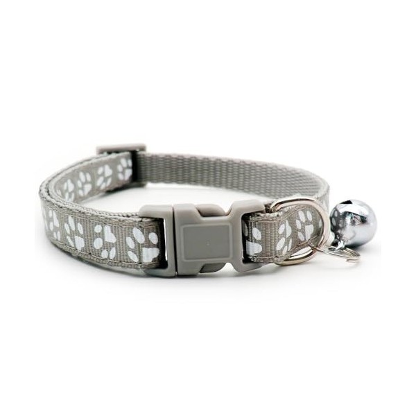 Doggie Style Store Dog Puppy Pet Small Medium Collar 2 Sizes Pawprint Design with Bell Nylon Adjustable Light Silver Grey M