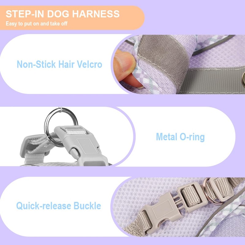 - 【Soft Breathable Mesh】Step-in dog harness is made of premium knitted mesh fabric,which is lightweight,high-density,flexible,and super comfortable,suitable for all seasons,keep your pet cool even in the hot weather,and the sturdy webbing can prevent chewing or tearing. Your dog will enjoy the daily walking in this comfort no pull dog harness!