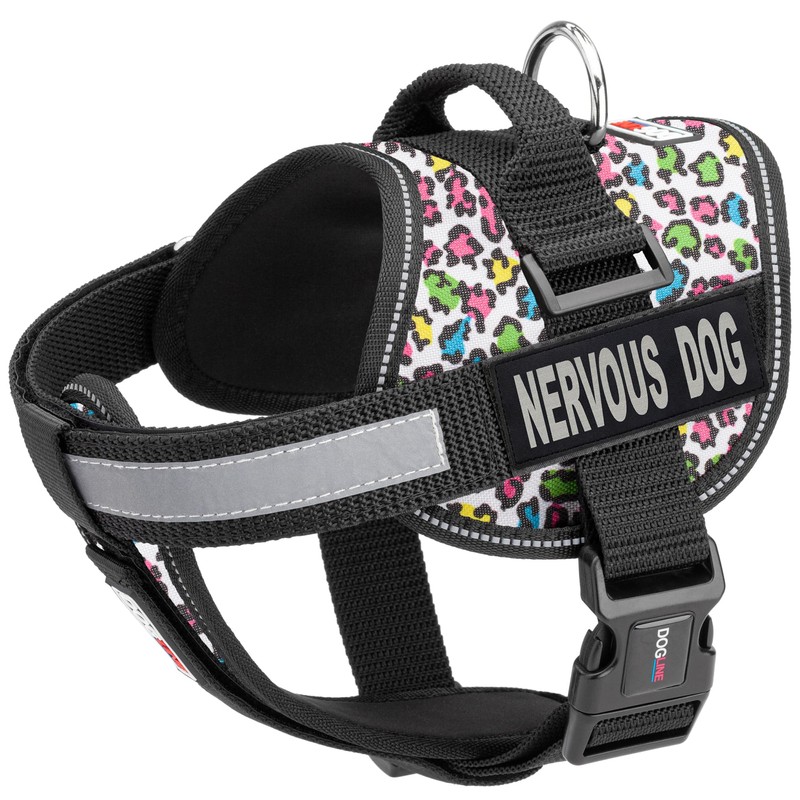 Dogline Unimax Dog Harness Vest with Nervous Dog Patches Reflective, Adjustable Straps, Breathable Neoprene for Medical, Service, Identification and Training Dogs Girth 36 to 46" Leopard Multicolor