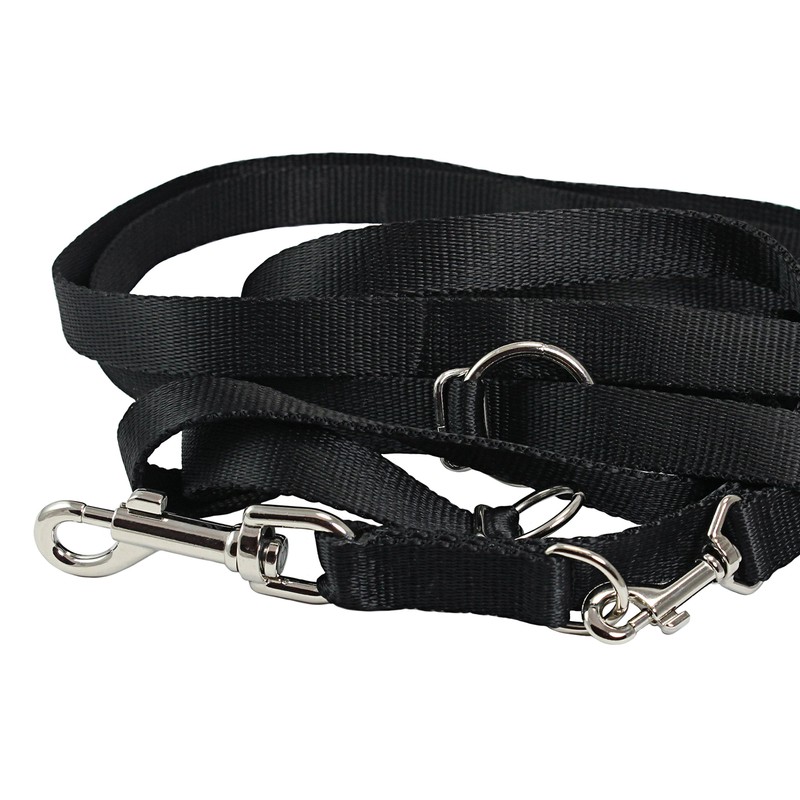 Multi-function dog leash. Made of strong and durable fray resistant 3/4" wide nylon. Features strong nickel plated durable swivel snap and rings. Easily converts from 5.5-ft to 7ft, 8ft, 10ft leash, to over shoulder leash, or 2 dog leash. Most suitable for Medium breeds.