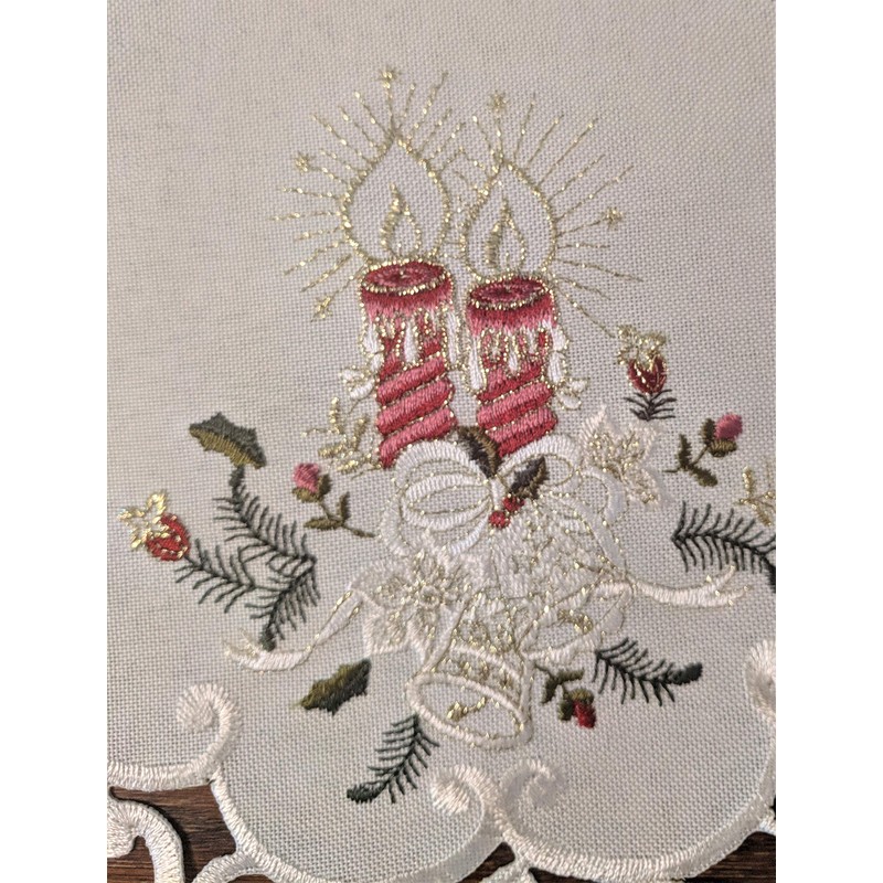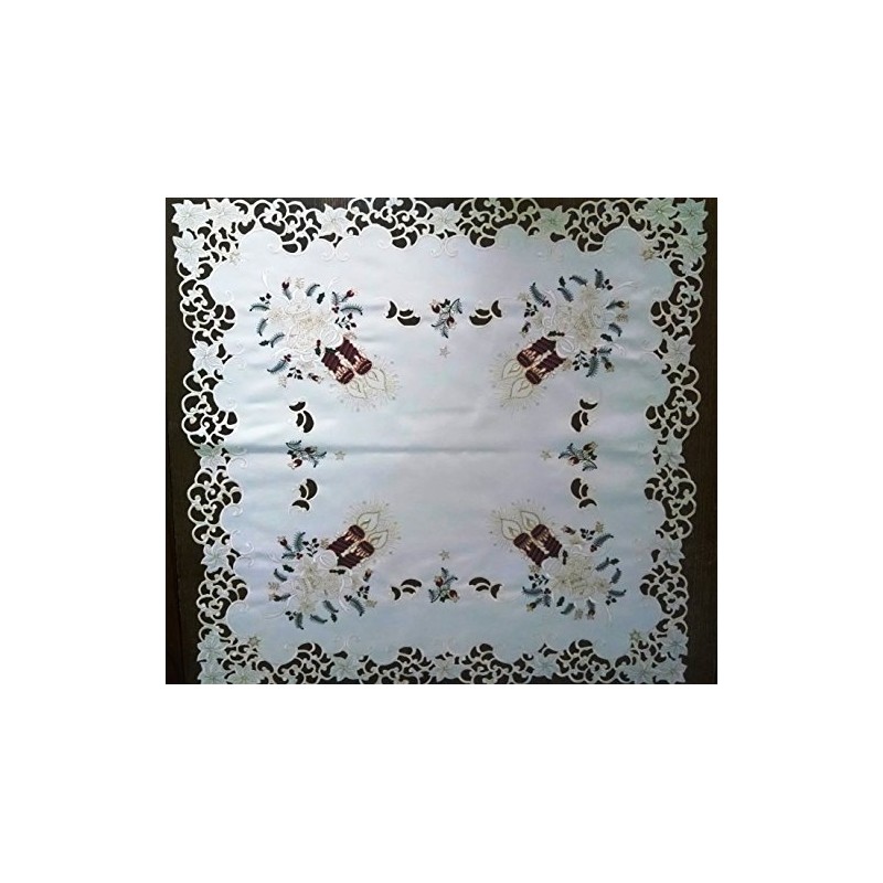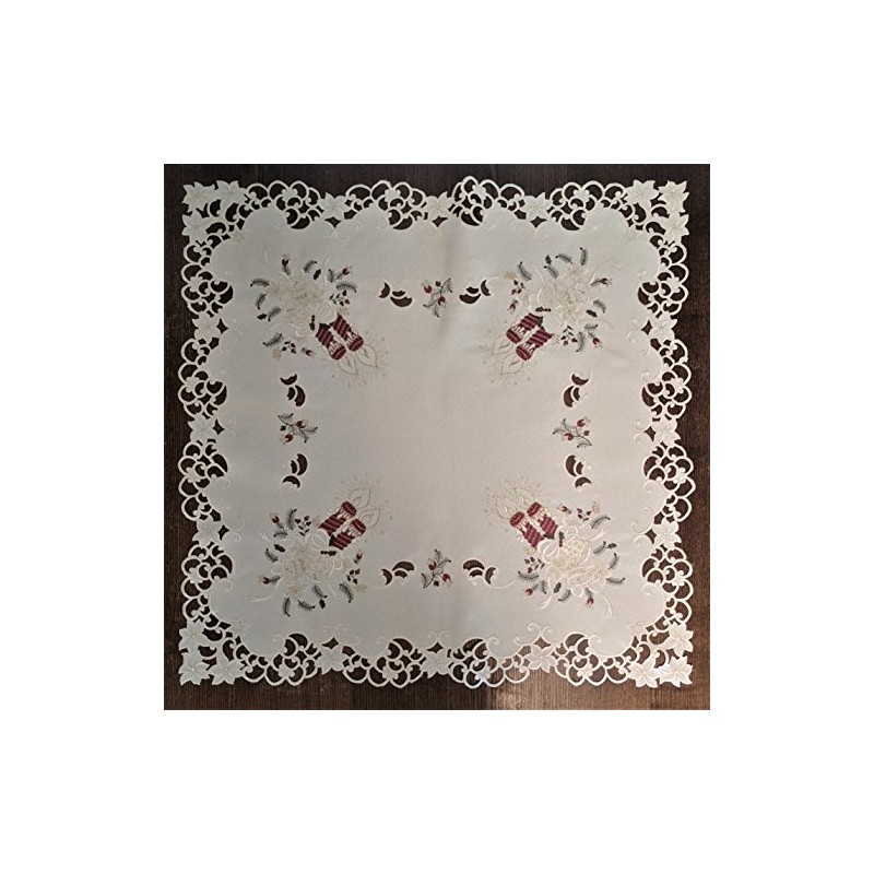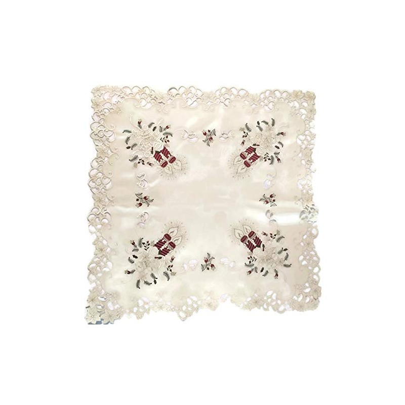 Doily Boutique Christmas Tablecloth or Table Topper Square with Burgundy Candles on Ivory Material, Size 34 inch
