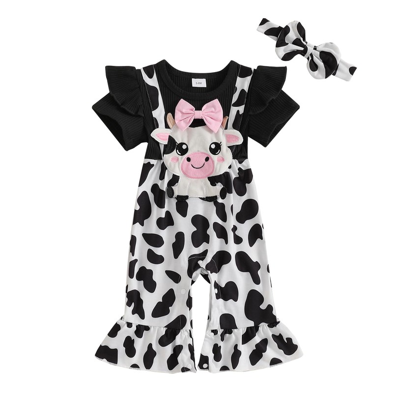 - Feature: Baby girl spring clothes, baby girl clothes summer; Short sleeve, round neck, cow embroidery, patchwork, bell-bottom, snap closure, easy to change diapers; Comes with a headband. Baby girl western clothes, cow romper baby, cow baby clothes,cowgirl baby clothes, infant cowgirl outfit, summer baby girl clothes