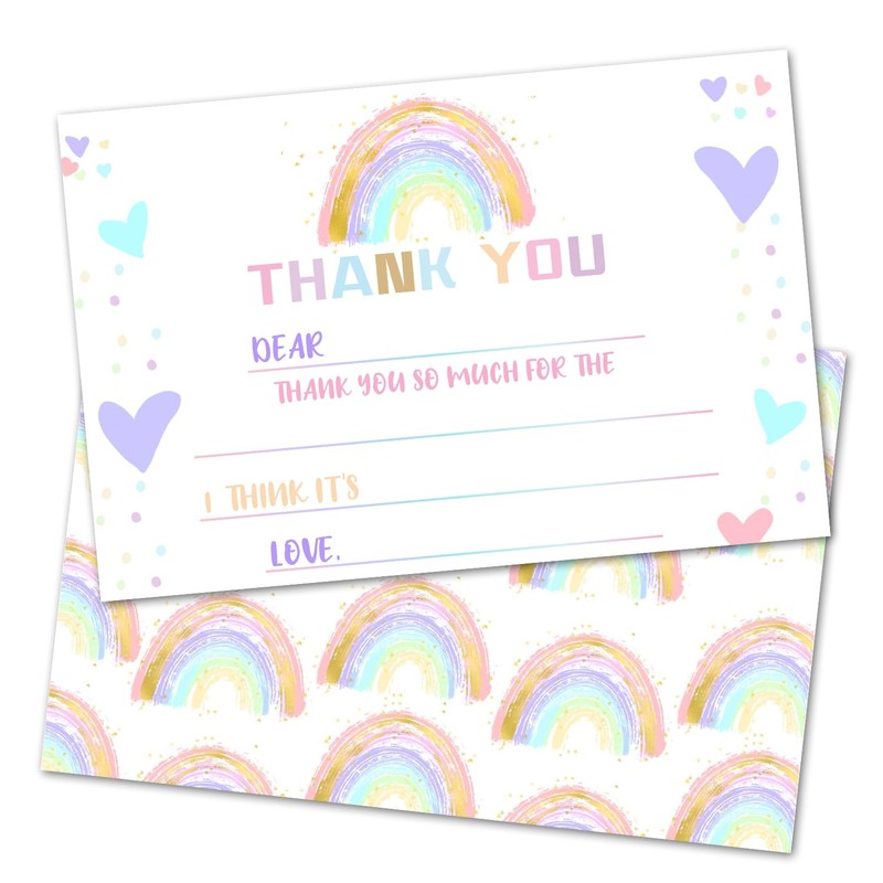 DOIUCRO Boho Rainbow Thank You Cards, 20 Rainbow Theme Thank You Cards with Envelopes, Fill in card for Teen Boy Girl Thank you Cards for Birthday Party Decorations Favor -01