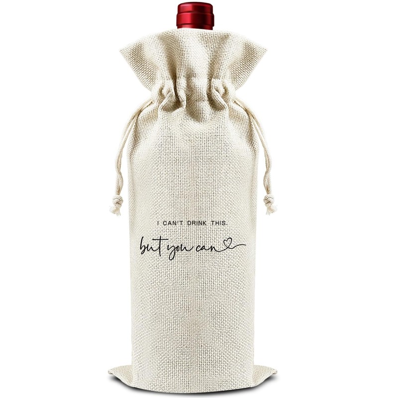 DOIUCRO I Can't Drink This But You Can - Gifts for Women Wine Bags, 1 PC Reusable Drawstring Burlap Wine Bottle Bags, Reveal Gifts for Friends Coworkers, Wine Gift Bag Wine Accessories -05