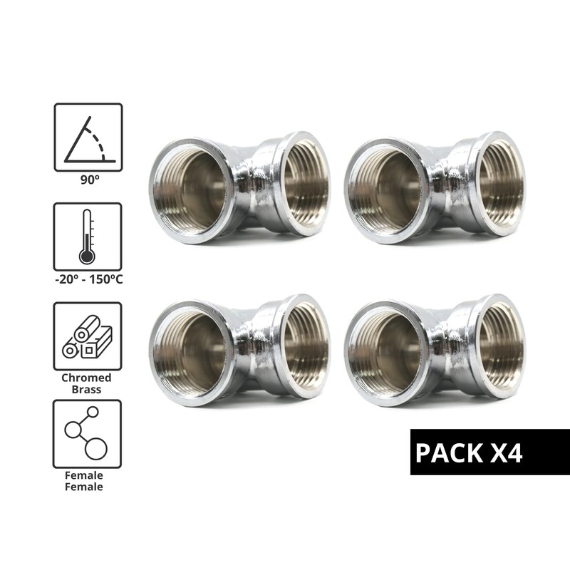 DOJA Barcelona 90° Threaded Fitting Made of Chrome-Plated Brass | 1/2 Inch | 4 Pack | 2 x Female Thread | Brass Angle | Pipe Angle for Irrigation Systems | Angle Pipe for Radiator Pipes, Compressed Air Pipes