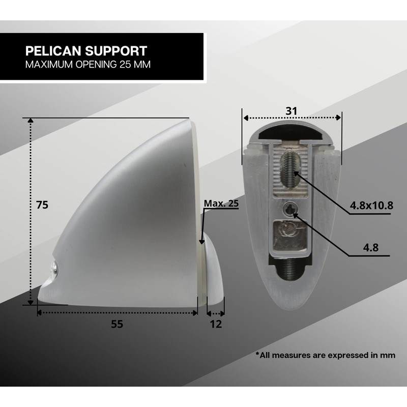 - Pack of 2 Pelican shelf brackets for glass and wooden floors with a thickness of max. 25 mm and size L / load capacity 10 kg. The distance between the floor supports must not be more than 500 mm. Depth: 75mm Width: 31mm Small, simple and elegant design. It is a storage aid in your home and matches your decor style.