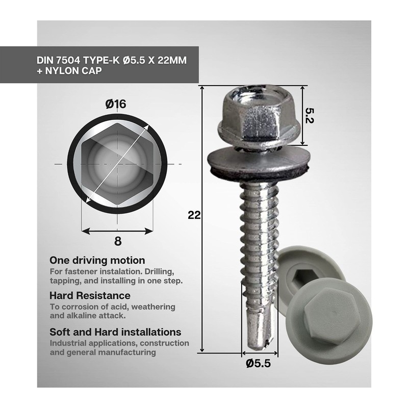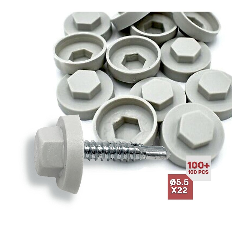 - Pack of 100 5.5 x 22 screws + 100 M8 screws cover caps grey made of plastic. The self-tapping screws are made of high-quality galvanised steel for perfect corrosion protection. Strong and durable. Depending on the application, choose the suitable size for screw + drill. Our self-tapping screws cover all requirements: aluminium sheet, stainless steel sheet, car body, galvanised sheet steel, aluminium sheet, roof plate.