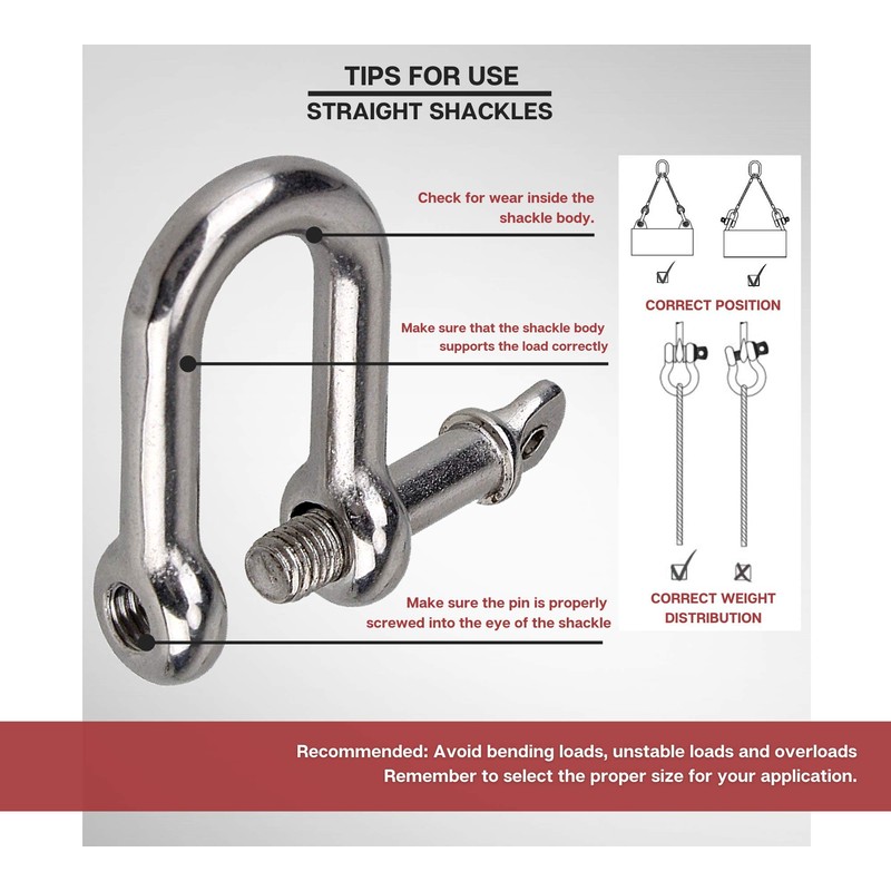 - Make sure the pin is properly screwed into the eyelet of the shackle: tighten it by hand and then secure it with a wrench or other suitable tool. Make sure the shackle supports the load correctly, i.e. along the center line. Avoid bending loads, unstable loads and overloads.