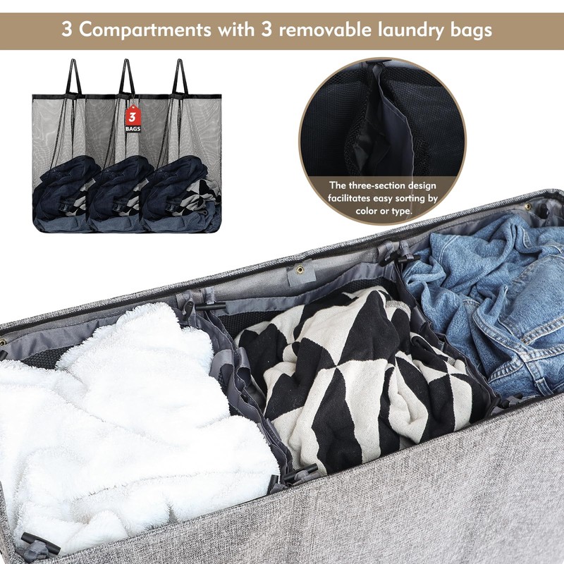 - Three Compartments Design: The laundry basket features three removable laundry bags for easy sorting and organizing of dirty clothes, ensuring a tidy setup.