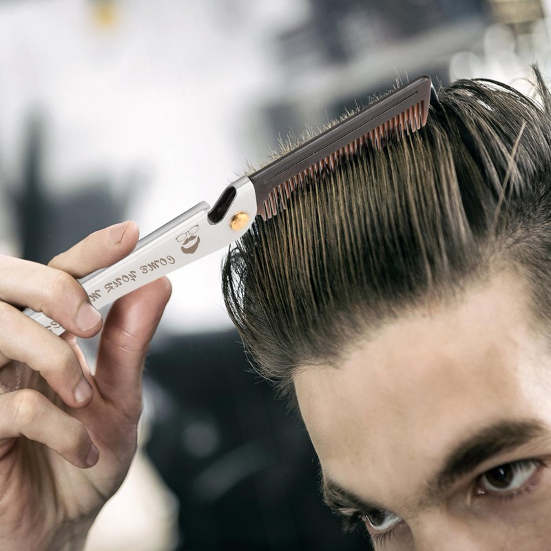 1 Portable Design This folding beard comb features a portable design and can be easily carried in your pocket. It is an ideal travel, car or office comb for modern men to quickly trim hair, beard and moustache. Preserves beauty: the teeth of our hairstyle comb are wide, smooth and round, which does not hurt the scalp and hair. It is suitable for all types of hairstyles, especially greasy retro hairstyles and beard repairs. It can preserve your beauty permanently.