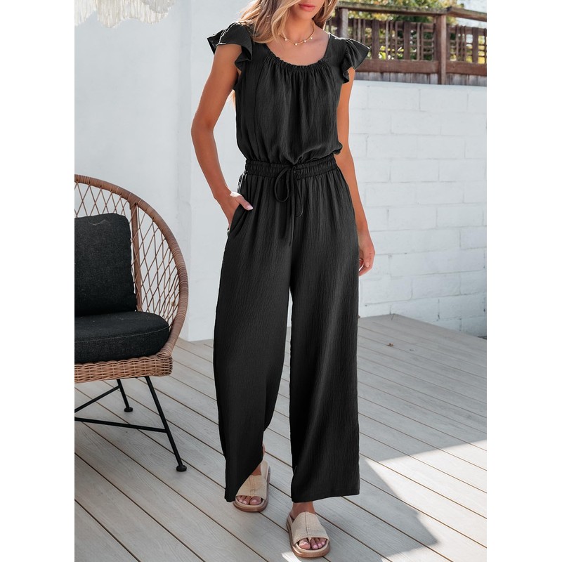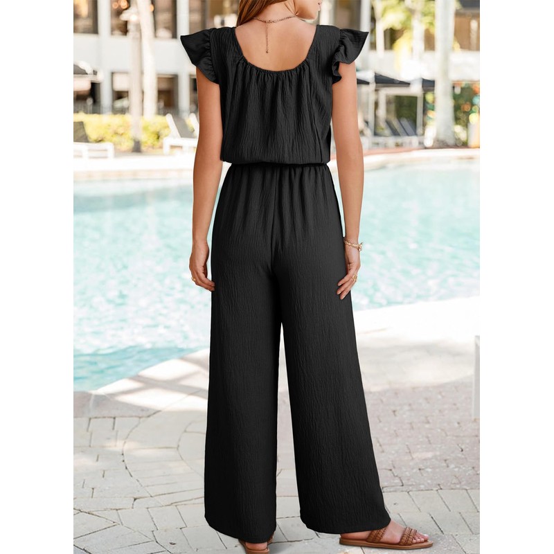 Dokotoo Jumpsuits for Women 2025 Fall Ruffle Sleeves Square Neck Rompers Beach Vacation Essentials High Waisted Wide Leg Pants Dressy Resort Wear 2025 with Pockets for Party,Black Medium