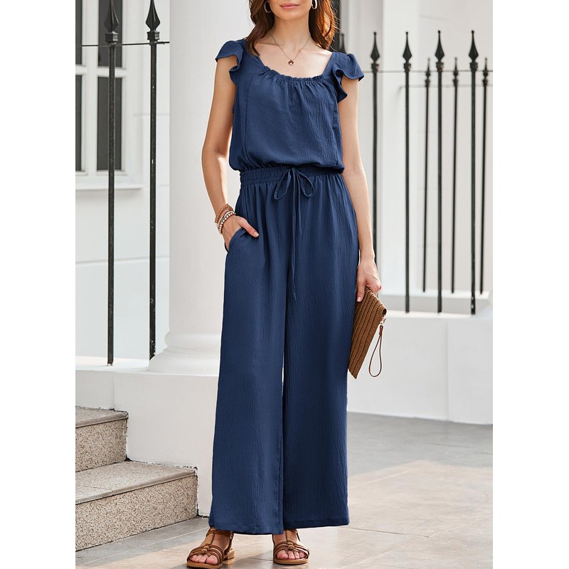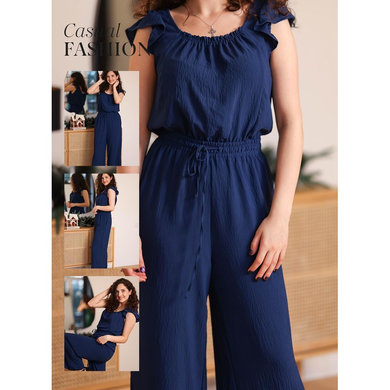 Dokotoo Jumpsuits for Womens 2025 Fall Ruffle Sleeves Cute Square Neck Maternity Jumper Drawstring Smocked Waisted Wide Leg Pants Dressy Cruise Outfits Plus Size with Pockets for Parties,Navy Large