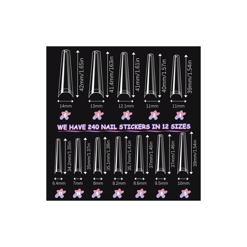 Dokpav 240 unidades Uñas postizas largas y afiladas, 12 tamaños uñas postizas con estuche para salón de uñas, transparentes, cobertura completa, 1 caja de 240 unidades
