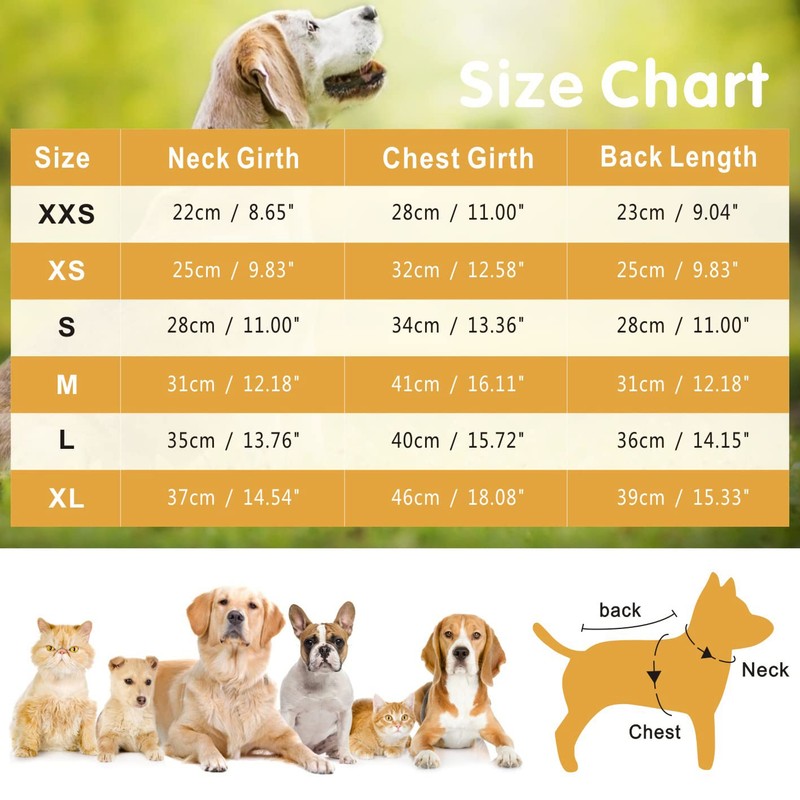 2.Since different manufacturers have different size standards, and different dogs have different body shapes, please measure your pet's Front Length,Collar and refer to size information before buying to avoid dog coats that are not suitable for your dog.