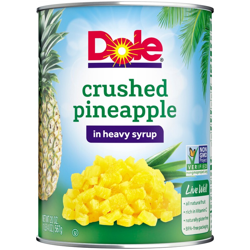 - NATURALLY GLUTEN FREE: DOLE Crushed Pineapple in Heavy Syrup is rich in Vitamin C, and made from all natural fruit and non-GMO ingredients. It's naturally gluten free and Kosher, and great for recipes like candied pineapple!
