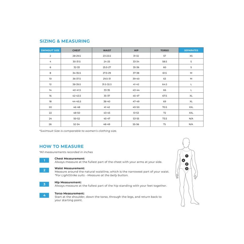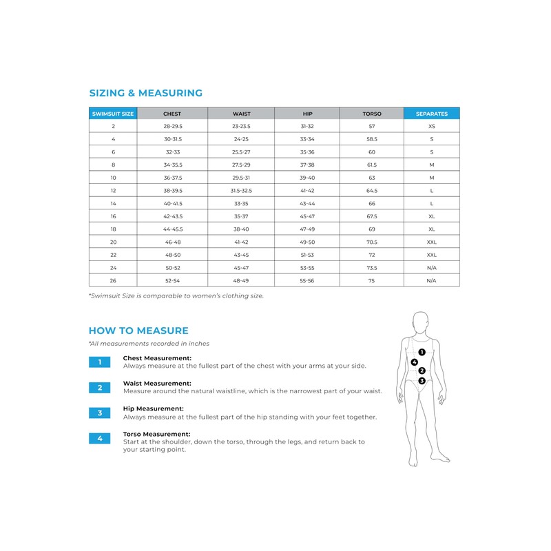 • Find Your Size: Use the size chart in the photo section to find your accurate size and the best fit for you. If your measurements are between two sizes, Dolfin recommends sizing up. Swimwear should fit snug to the body for secure wear