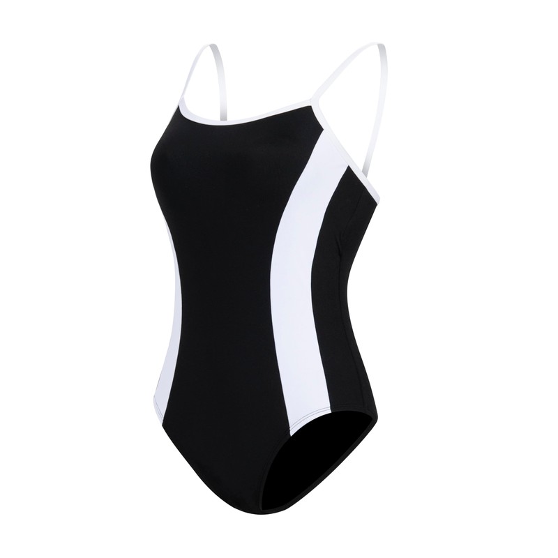Suit up in this wonderfully simple black straight back moderate lap suit one piece swimsuit! This solution swimwear suit offers a solid black base color with white side stripes, which is ultra-flattering. Don't worry, we are here to help you remain confident!