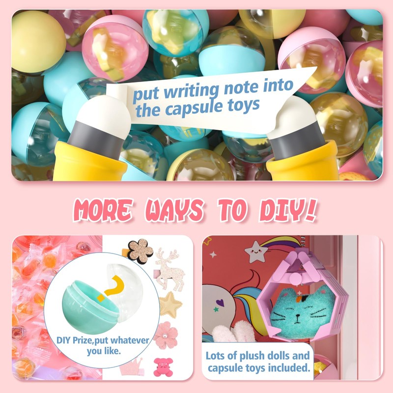 - What’s Included: The kids claw machine measures 11.41 x 6.69 x 9.45 inch and includes 12 plastic coins for play. The time to play for one coin is 60 seconds. A USB cable, a cute sticker, six random dolls, 10 capsule Toys, three grasping handles, one volume button and one music switch button. Powerful clamp, easy to grasp.When the doll is successfully grabbed and dropped, the doll will make cheering sound effects.