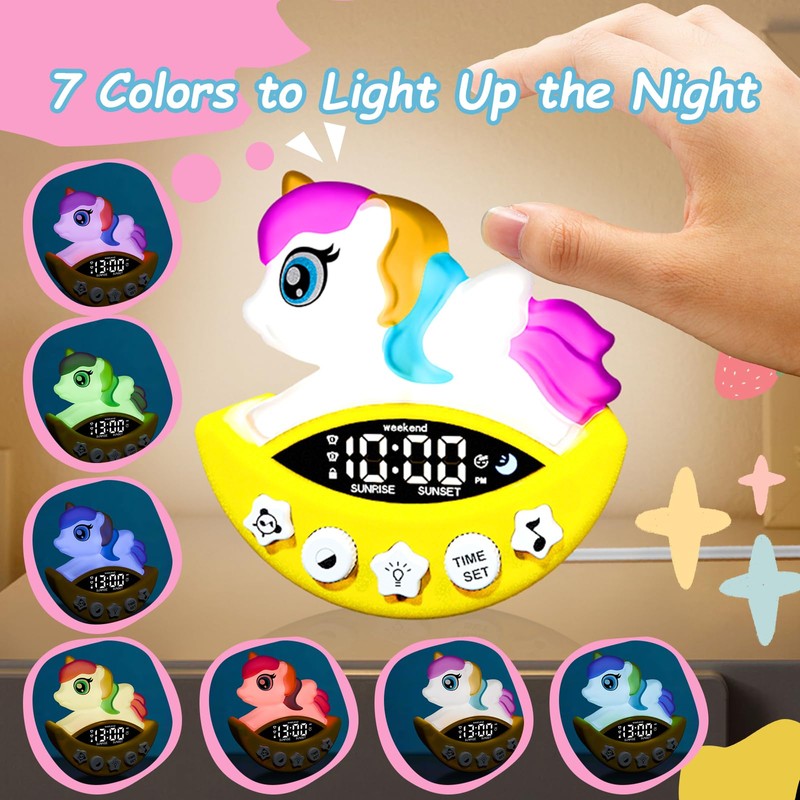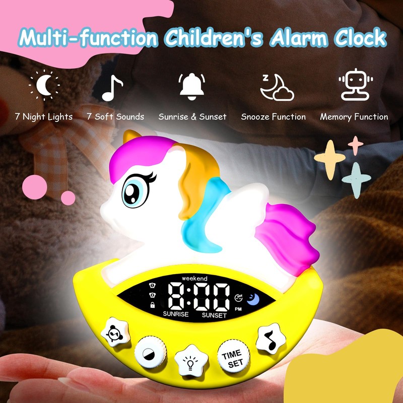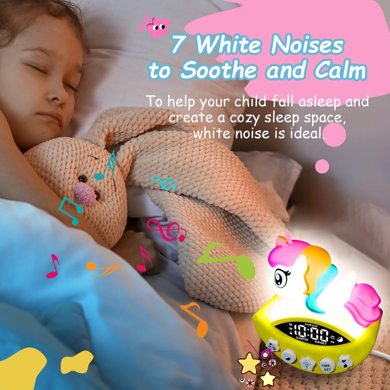 - Ok to Wake Clock for Kids:With 7 different night light colors and soothing sounds,this unicorn toddler clock helps your kid when it's time to sleep and wake up.It’s a great tool for encouraging healthy sleep habits and helping children stay on a consistent routine.