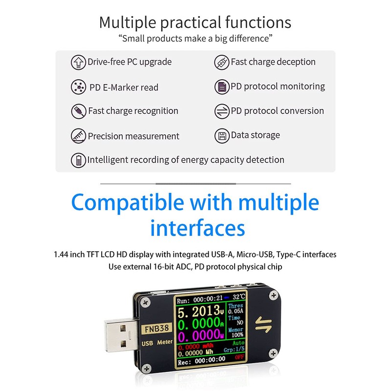 - USB 2.0 interface, 1.45 inch TFT LCD high definition display with built-in USB-A, micro USB, Type-C interfaces, use external 16-bit ADC, PD protocol physical chip.