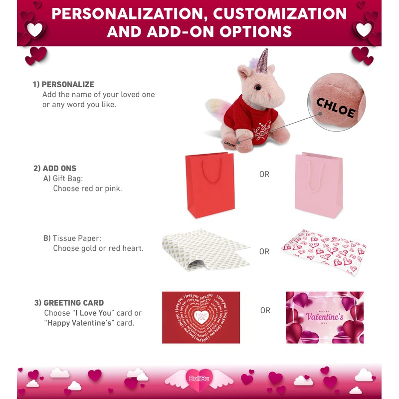 - PERSONALIZATION, CUSTOMIZATION AND ADD-ON OPTIONS - Pink Unicorn Plush comes customized with an "I Love You" message on a Red Shirt. Then you can personalize it with the name of your loved one, which we will imprint on the item. And lastly, you can add some or all of the cool add-ons to make your gift extra special: 1) a Red or Pink Gift Bag, 2) Red or Gold Hearts Tissue Paper, 3) a Greeting Card - I Love You or Happy Valentine.