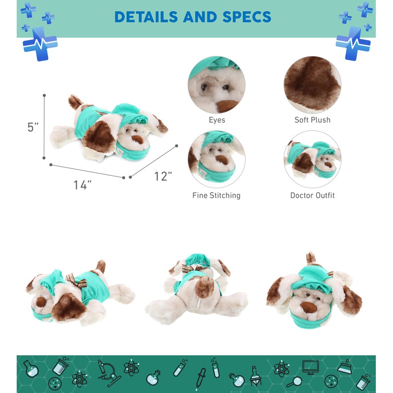 - INCLUDED WITH THE PURCHASE - Includes 1 Super Soft Lying Dog Plush Toy in a doctor's uniform. The dog plush animal wears a doctor's uniform shirt blue-green scrub suit with a face mask & scrub cap. The green scrub cap complements the stuffed toy's cute uniform. The body is made of soft fabric & fluffy fur that makes the bear doctor perfect for cuddles & snuggles. This cute lying dog doctor stuffed toy measures 14L x 12W x 5H inches.