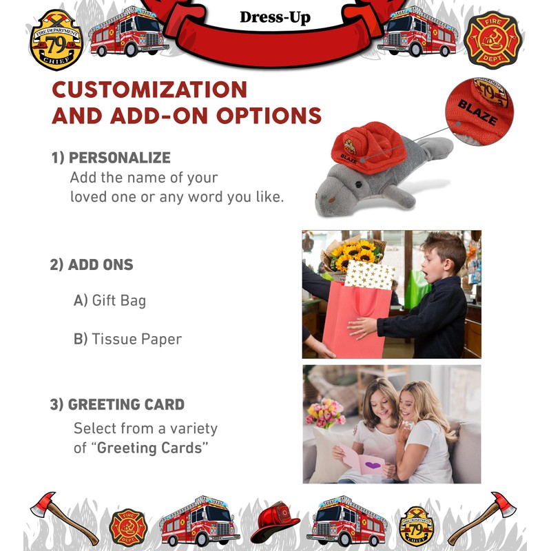 - PERSONALIZATION, CUSTOMIZATION, AND ADD-ON OPTIONS - Super soft manatee firefighter plush features a red fireman toy costume wearing a firefighter hat. Personalize your plush firefighter toys with the name of your loved one, which we will imprint on the item. You also have the option to customize your fireman plush by adding some or all of our cool add-ons to make it extra special: 1) Gift Bag 2) Tissue Paper 3) Greeting Card.