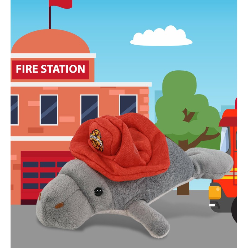 - INCLUDED WITH THE PURCHASE OF FIREFIGHTER DOLL - Includes 1 super soft manatee plush toy with fireman plush animal hat. The manatee is dressed in a realistic firefighter hat. It comes with a red firefighter hat, and a fire department patch. Pair your firefighter plush with your firetruck plush toy for a fun pretend play. Each manatee fire fighter toys' measures 9Lx5.5Wx3H inches. Ideal fireman kids stuffed animal age 0 and up.
