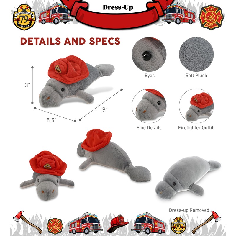 - INCLUDED WITH THE PURCHASE OF FIREFIGHTER DOLL - Includes 1 super soft manatee plush toy with fireman plush animal hat. The manatee is dressed in a realistic firefighter hat. It comes with a red firefighter hat, and a fire department patch. Pair your firefighter plush with your firetruck plush toy for a fun pretend play. Each manatee fire fighter toys' measures 9Lx5.5Wx3H inches. Ideal fireman kids stuffed animal age 0 and up.