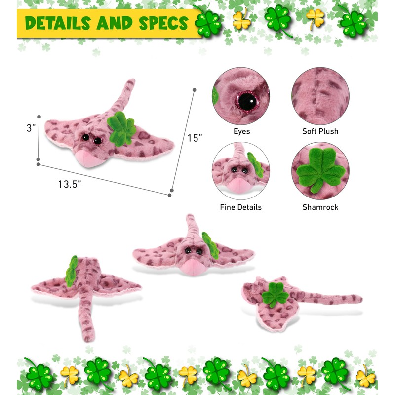 - THE SHAMROCK PLUSH STINGRAY IS FOR EVERYONE WHO LOVES STUFFED ANIMALS - The Super Soft Pink Rose Stingray plush toy with an Irish shamrock is for everyone looking for personalized stuffed animals to celebrate St Patricks Day. Perfect for Saint Patricks Day decor or cool prizes on St Patricks Day Games. Let the good and fun times roll with this stingray with a green plush shamrock; cute green St Patricks Day Gift to give this festive season.