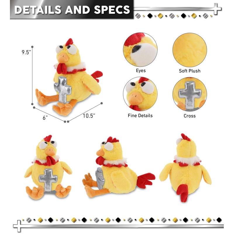 - THE ROOSTER SILVER CROSS PLUSH IS FOR EVERYONE WHO LOVES SOFT STUFFED ANIMALS - The Super Soft Yellow Rooster stuffed animal with cross for girl and boy makes for sweet baptism gifts for girl and boy, as well as christening gifts. Celebrate your faith and share the passion with your loved ones by giving them cuddly stuffed animals for kids. Metallic silver cross plush can also be presented as a healing or feel better plush toy.