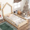 Dolonm Twin Size Montessori Toddler Floor Bed Frame, Modern House-Shaped Frame Headboard Bed with Fences, Pine Wood with Full-Length Guardrails, Bed for Girls Boys(Without Slats), Natural Wood