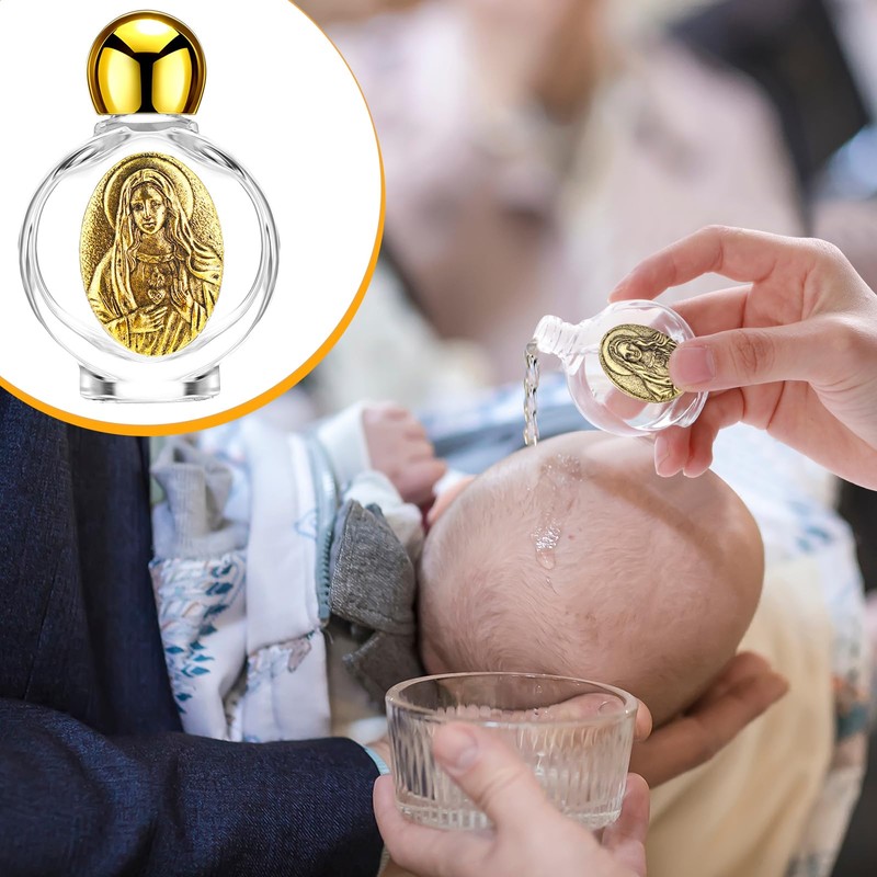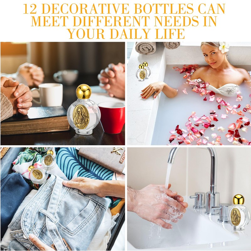 - Clear Glass Bottle: small gold holy water bottle can be applied to store holy water or other liquids, fill essential oil bottles, portable perfume bottles; 12 decorative bottles can meet different needs in your daily life; Holy water bottle with silver cap and gold immaculate heart of Mary; When you use it, the beautiful appearance will make you more elegant and charming