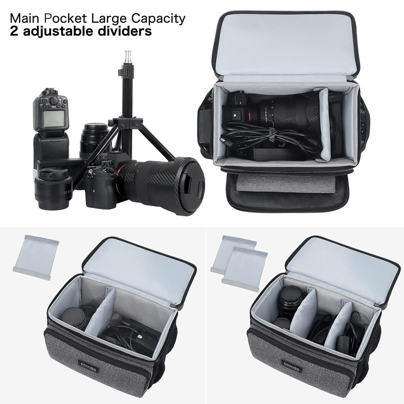 - Large capacity: The camera bag is divided into top and bottom compartments and offers enough space for your camera. Front pockets organize cables, phone, batteries, memory cards and other camera accessories. Small pockets on both sides. Suitable for Nikon Canon Sony Pentax Olympus Fujifilm DSLR Camera + Lens + Tripod + Other Accessories