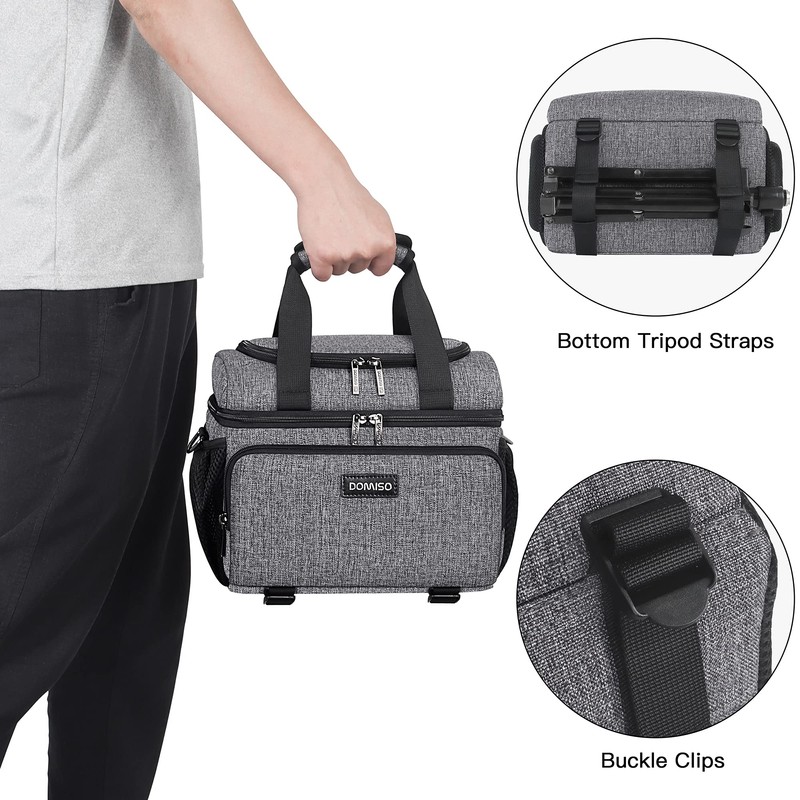 - Good quality: 1 waterproof polyester; 2 more padded interior and the flap on the top protect the camera equipment from bumps and bumps; robust and durable metal hook + adjustable shoulder strap; buckle clips on the bottom of this compact travel camera bag, which is used for small tripods, monopods or other things.