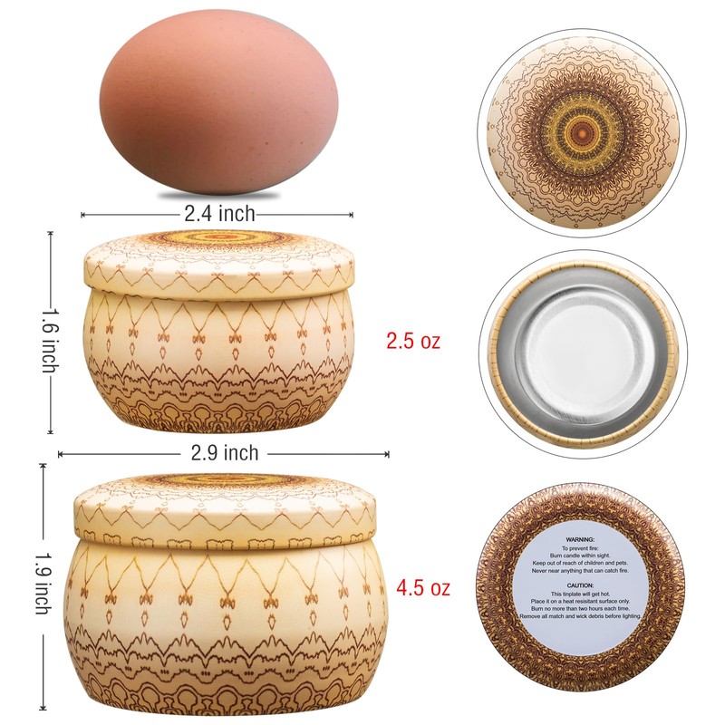 • Portable candle jars :8 styles, each empty can capacity 2.5 ounces; 1.6 "high, 2.6" diameter; 4.5oz 1.93 "high, 2.95" diameterThey are lightweight, durable and easy to carry.