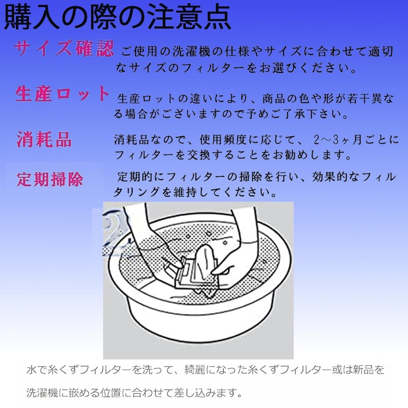 - Product Effect: Choose the right size filter according to your washing machine specifications and sizes. Please be aware that the color and shape of the product may differ slightly due to differences in production lots. They are all available