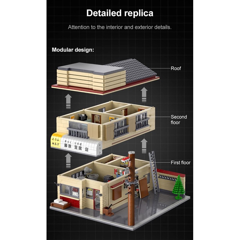 - SUPERIOR BUILDING BLOCKS – State-of-the-art engineering toy features a modular design include first floor, second floor and the roof. Model build features living room, tofu workshop, Takumi’s and Bunta’s detailed rooms and a parking lot for AE86 Trueno. This building model has opening walls to explore the details of the store!