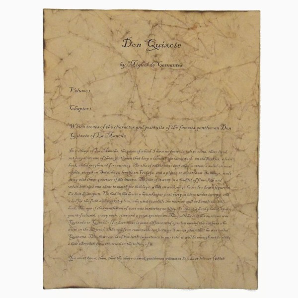 Don Quixote can now be remembered and cherished with this antiqued copy of the first page of Miguel de Cervantes's classic fairytale. Whether framed on a wall or used as part of a centerpiece, this beautifully aged paper will be loved by any Don Quixote fan. Our four step aging process transforms regular paper into paper that looks hundreds of years old. It not only LOOKS antique, but it FEELS antique, as well!