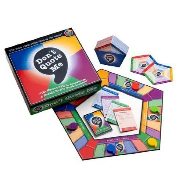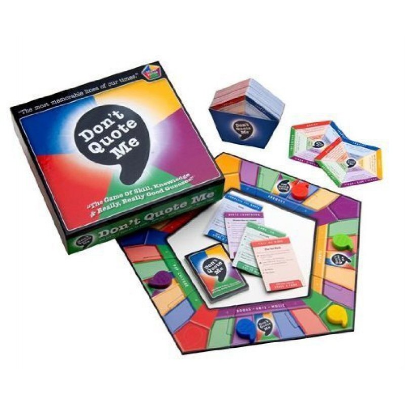 The Most Memorable Lines of Our Times. Everyone enjoys a great quote. Now you can celebrate the greatest lines of our times with the all-new Don't Quote Me game. Spanning the globe to celebrate great quotes, Don't Quote Me brings the fun of quotes to your next party. Players identify speakers of an amazing variety of memorable quotes from the historic to the hilarious, the noble to the notorious. The five all-encompassing game categories cover every aspect of human endeavor: Leaders, Sports, Books·Arts·Music, Movies and Pop Culture.