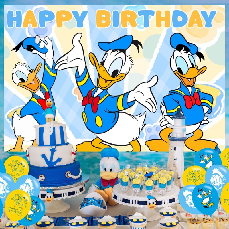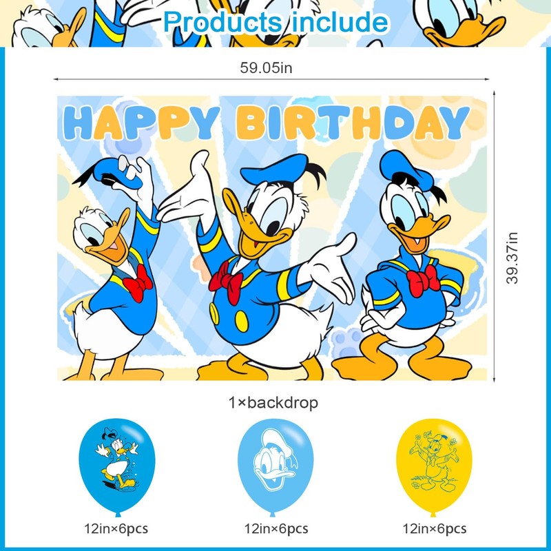 - 【Donald Duck Birthday Party Supplies】One 59x35.4 inches Happy Birthday Backdrop Banner, 18pcs Donald Duck party ballons,Happy Birthday backdrop banner is very popular among kids.