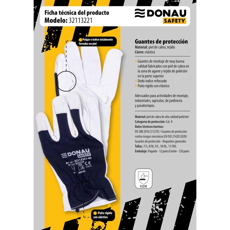 - DONAU SAFETY 32113221-10 leather gloves / leather work gloves / assembly gloves with elastic wrist - drawstring. Colour: white-dark blue. Size 10/XL - 1 pair Very high-quality assembly gloves made of goat leather in the grip area and polyester fabric in the upper area.