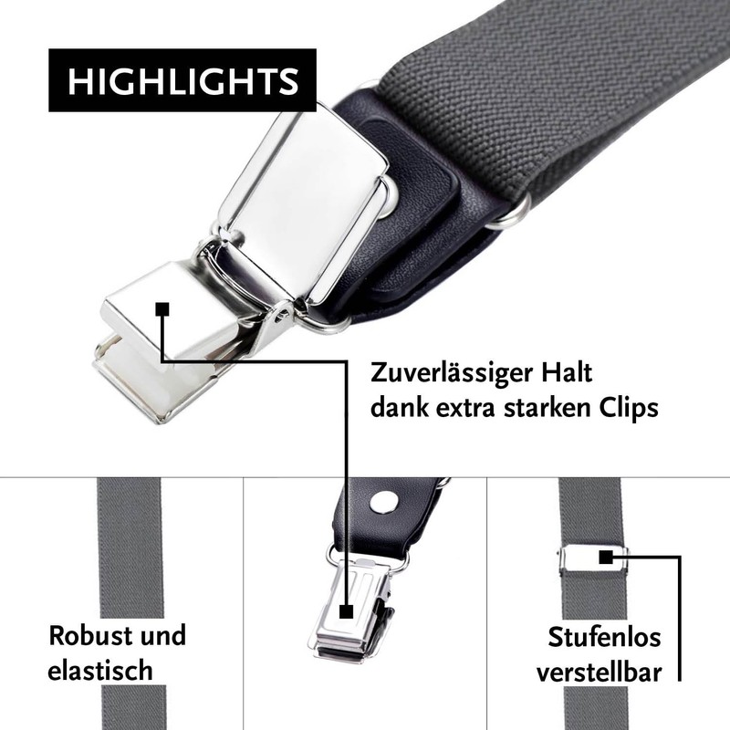 - EXTRA STRONG SUSPENSION CLIPS Our braces clips are extra strong and provide maximum grip. These suspenders for men are ideal for everyday use and guarantee reliability, whether it be at work or on festive occasions