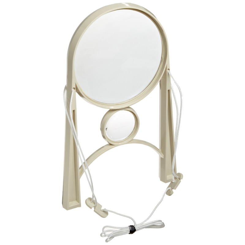 - Wearable magnifier with stand-off frame and adjustable neck band for hands-free viewing